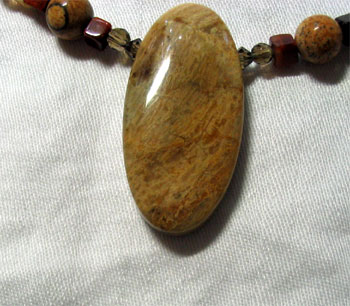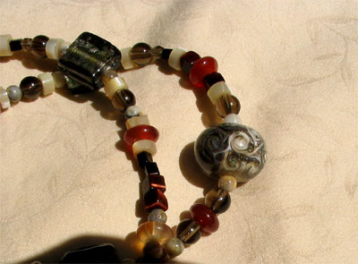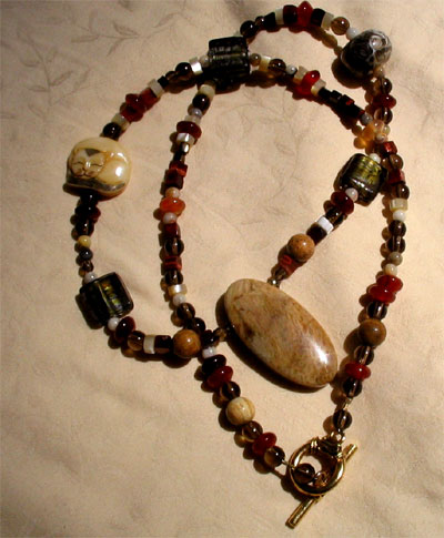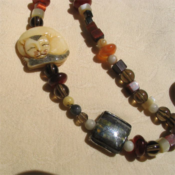 Necklace has 3 Lovely Focal Beads in Handmade Lampwork Glass, Polished Jasper, & Carved Bone. Necklace made of Jasper, Agate, Venetian Glass, Smoky Quartz, Carnelian, & Bone. Gold-Filled Toggle. Both sides of the bead design are symetrical, but one side has a bone-carved cat, the other has a stunning lampwork bead (Is this the kitty's ball of yarn?) Polished jasper anchor bead COLORS: Balanced Array of Earthy "Autumn" Colors: Moss Green, Rust Orange, Shades of Tan, Oak, Bone, Green, Cream, and Light Brown 24" Long, but can be shortened. |